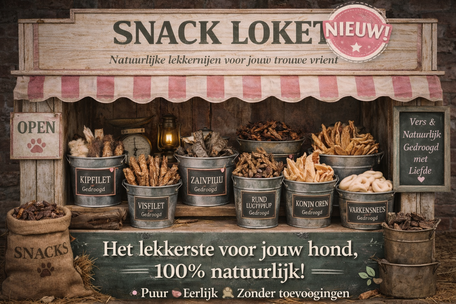 Een ruime variatie aan natuurlijke kauwproducten en snacks voor uw trouwe viervoeter. Het Snack Loket zal dan ook regelmatig vernieuwd worden.